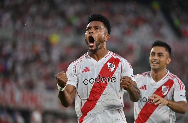 Maximiliano Meza de cabeza a los 23 del complemento puso el 1-0 para River luego de un centro de Franco Mastantuono.